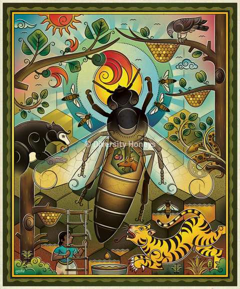 Sudarshan Shaw is an Indian artist, visual designer and creator of an art style he calls ‘Folk Indica’. Martin Kunz of Diversity Honeys became aware of Sudarshan’s work in a webinar on efforts to protect tigers in a nature reserve in the central India. The region is also the backdrop for Rudyard Kipling’s Jungle Book. Kipling called Apis dorsata the ‘most dangerous animal in the jungle’. That gave Kunz the idea to commission a work of art that put Apis dorsata into the centre.